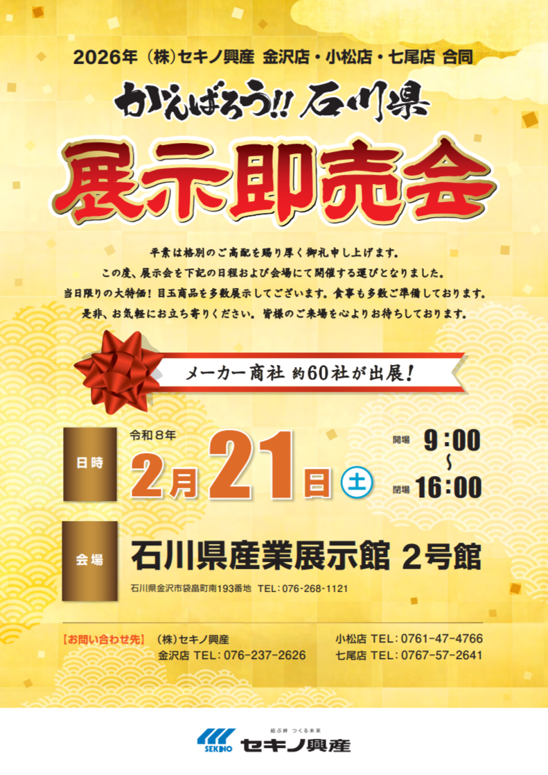 展示即売会のお知らせ【株式会社セキノ興産】 2025年12月1日 2025年12月1日 令和8年2月21日(土)、株式会社セキノ興産 金沢店・小松店・七尾店 合同 「がんばろう!!石川県 展示即売会」が開催されます。 詳細は以下の通りです。皆様のお越しをお待ちしております。