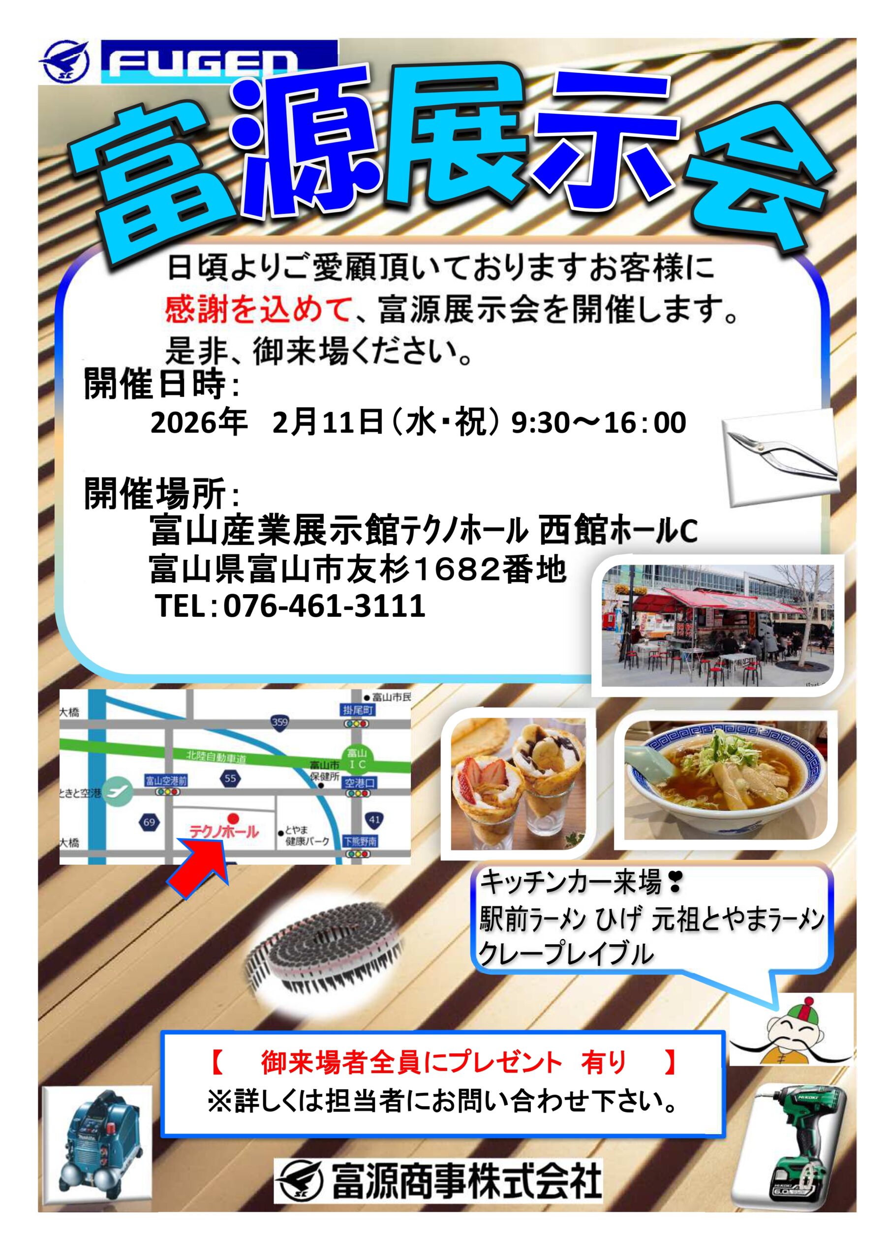 富源展示会のお知らせ【富源商事株式会社】 2026年1月8日 2026年1月9日 令和8年2月11日(水・祝) 富源商事株式会社様より展示会のお知らせです。 日頃よりご愛顧頂いておりますお客様に感謝を込めて「富源展示会」を開催します。 皆様のお越しをお待ちしております。 是非、御来場ください。 詳細は以下の通りです。皆様のお越しをお待ちしております。